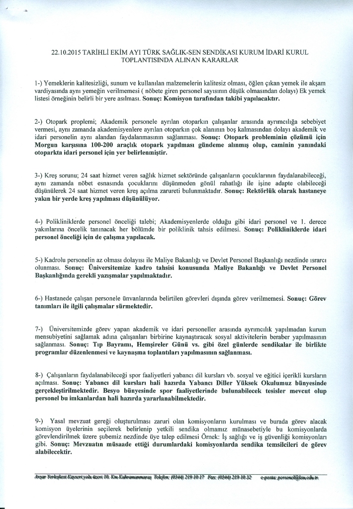 22.10.2015 Tarihli Ekim Ayı Türk Sağlık-Sen Sendikası Kurum İdari Kurul Toplantısında Alınan Kararlar