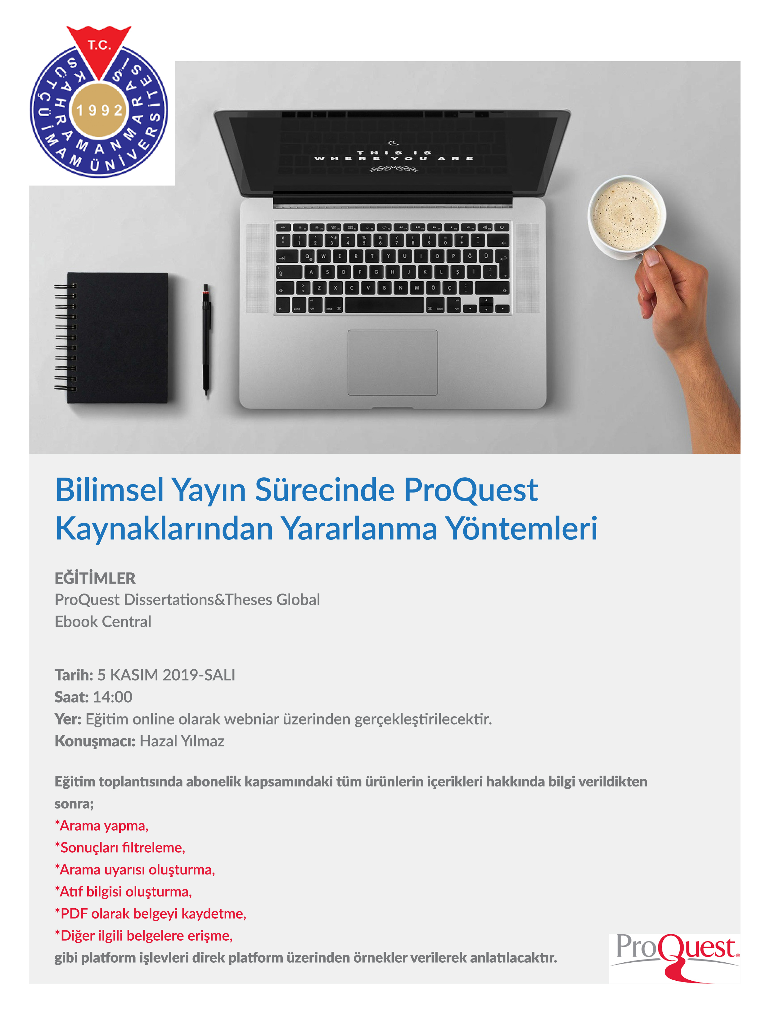 Kütüphane ve Dokümantasyon Daire Başkanlığı' nın düzenlemiş olduğu Proquest Veritabanı Eğitimi, 5 Kasım 2019 Salı Günü Saat 14.00'da online olarak verilecektir.