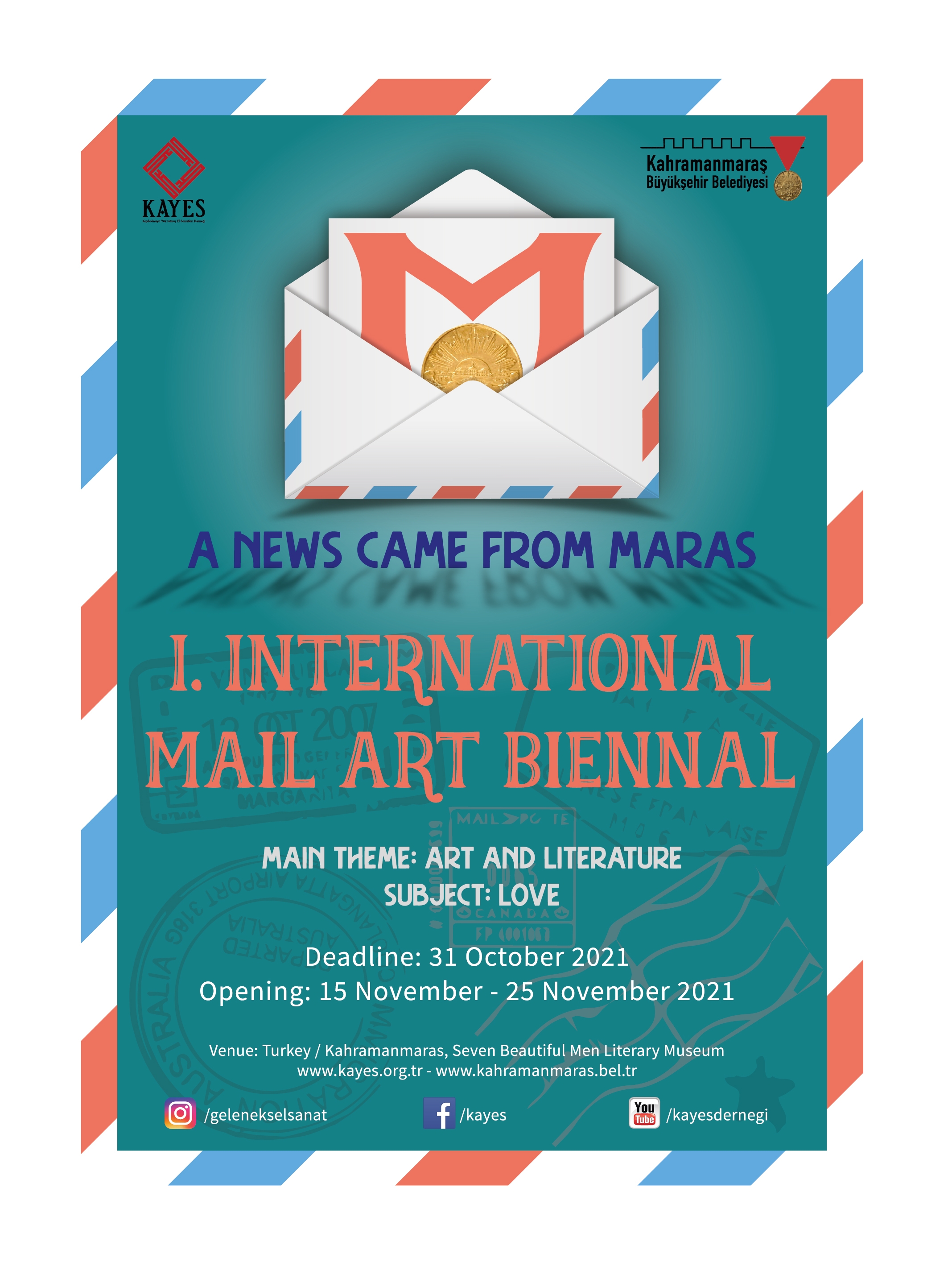Kahramanmaraş Büyükşehir Belediyesi ve KAYES (Kaybolmaya Yüz Tutmuş El Sanatları Derneği) iş birliğinde 15-25 Kasım 2021 tarihleri arasında ekli program çerçevesinde “Maraş'tan Bir Haber Geldi 1.Uluslararası Mail Art Bienali” gerçekleştirilecektir.