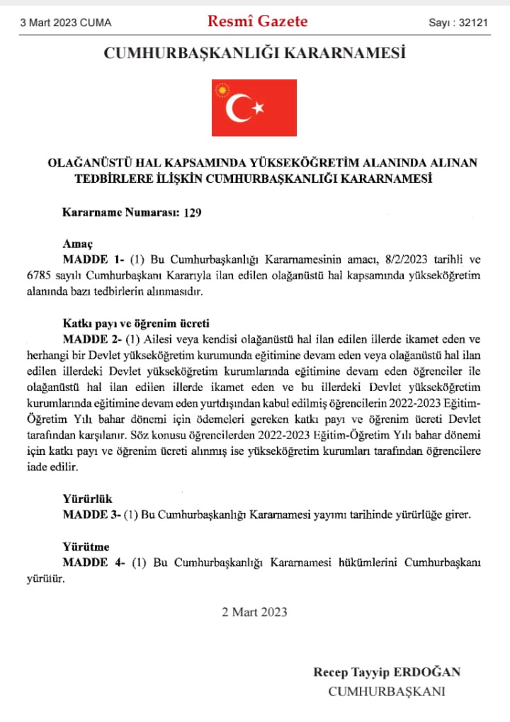 Katkı payı ve öğrenim ücreti ile ilgili Cumhurbaşkanlığı Kararnamesi