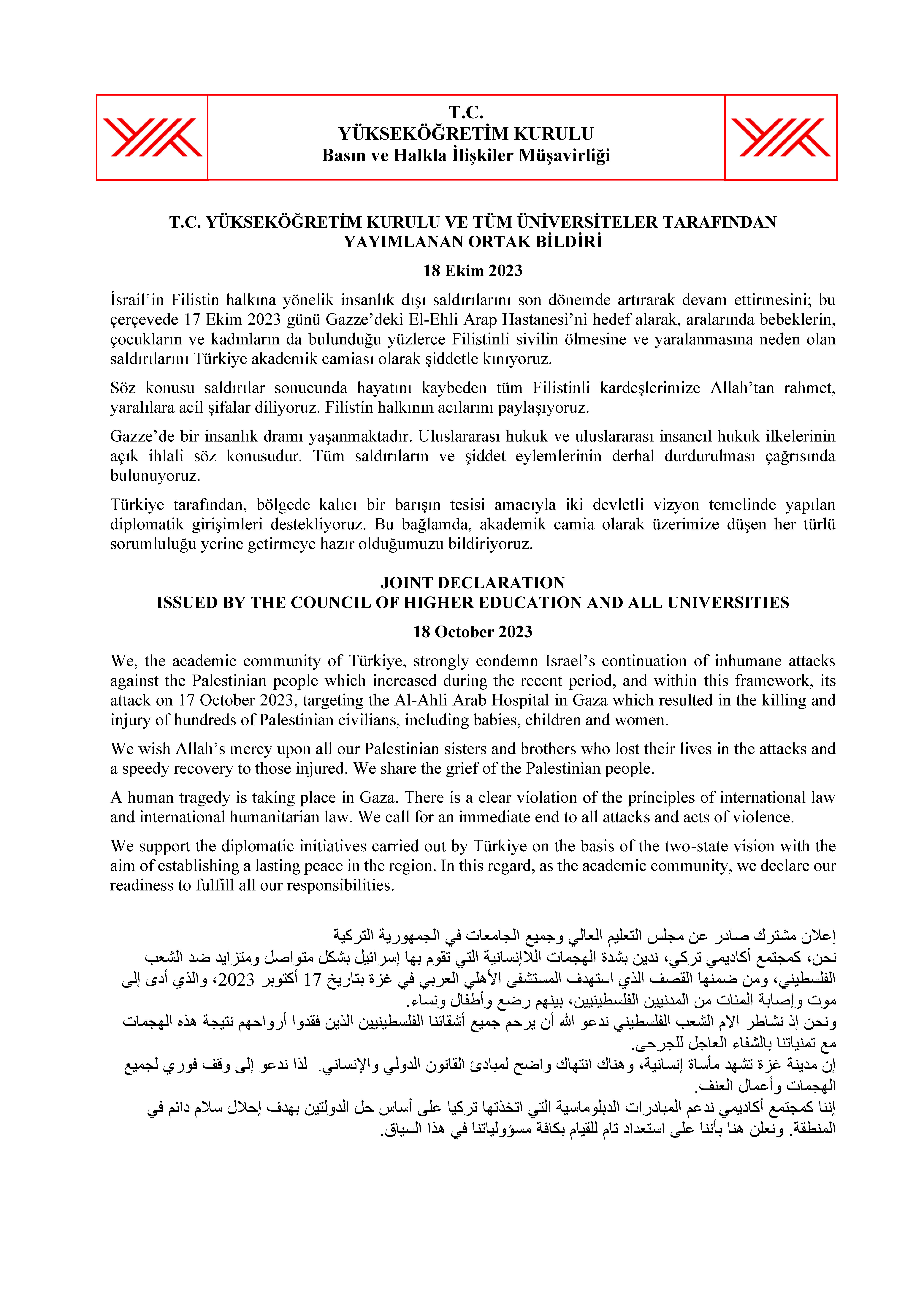 Yükseköğretim Kurulu Ve Tüm Üniversiteler Tarafından Yayımlanan Ortak Bildiri
