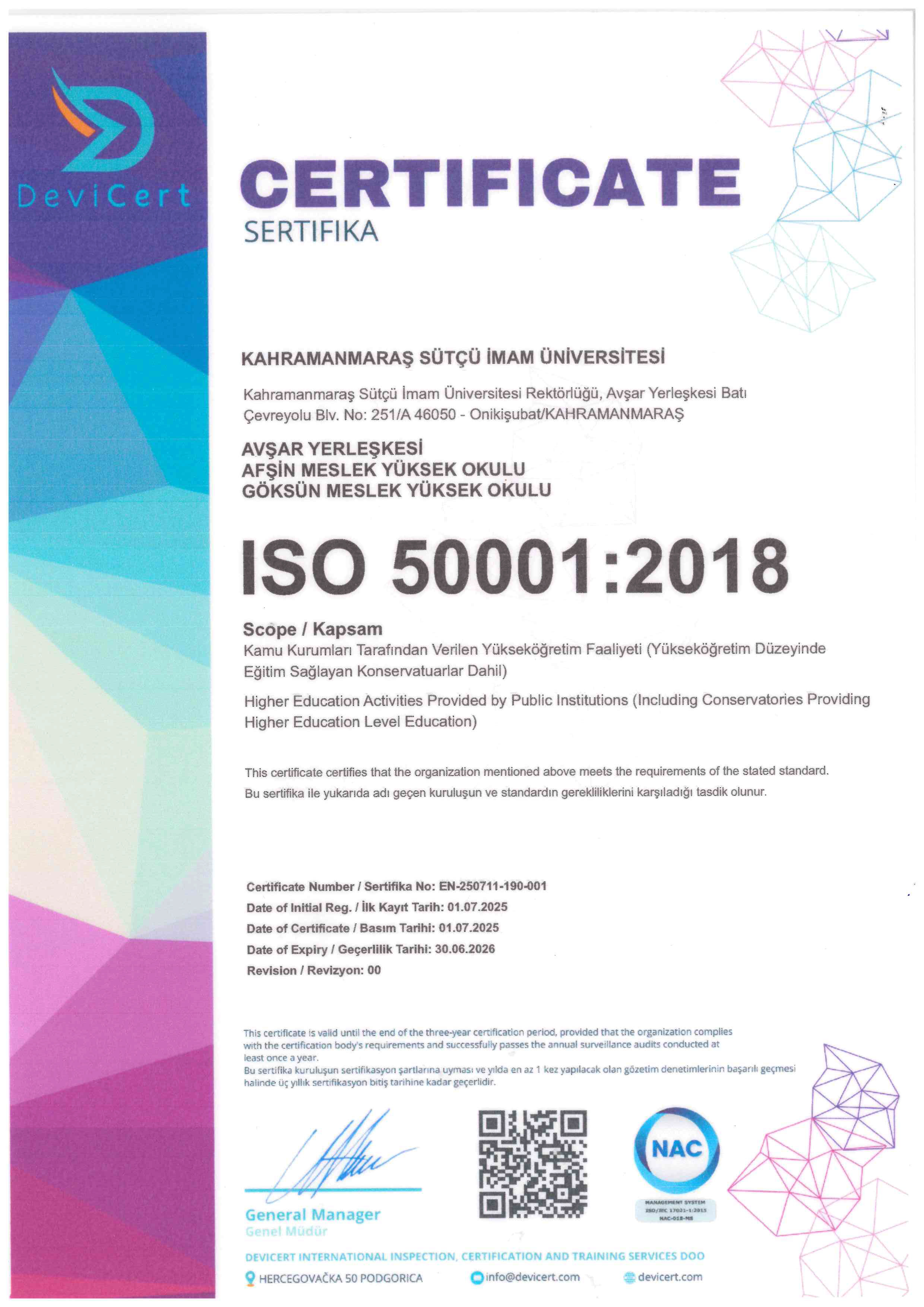 Üniversitemize TS EN ISO 50001 Sertifikası kazandırılmıştır