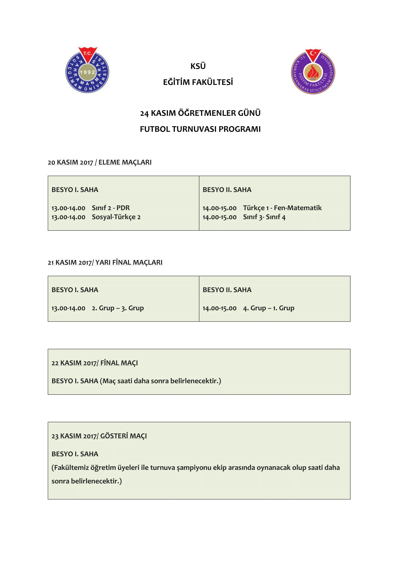 17.11.2017 - 24 Kasım Futbol Turnuvası Programı