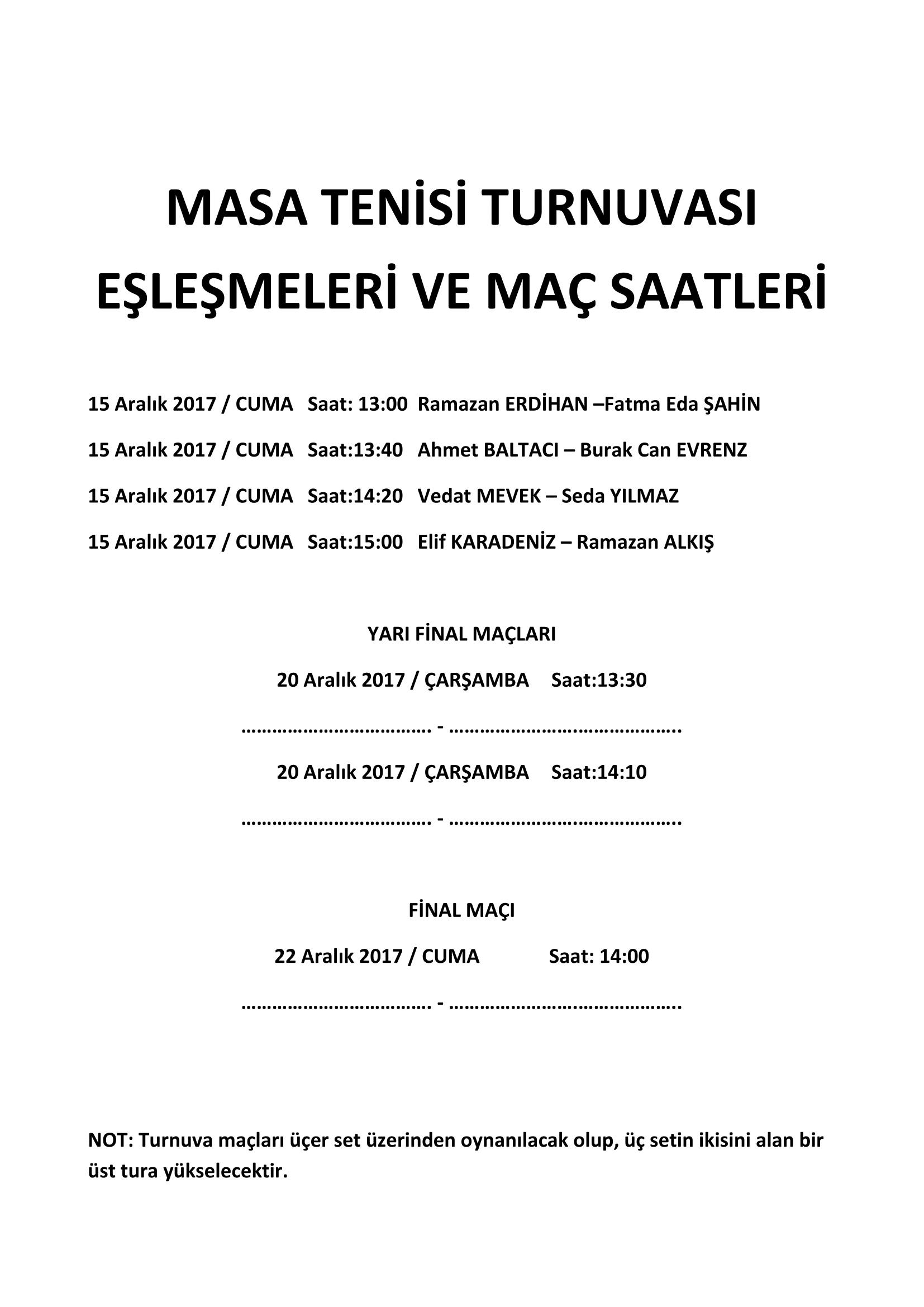 15.12.2017 - Masa Tenisi Turnuva Programı